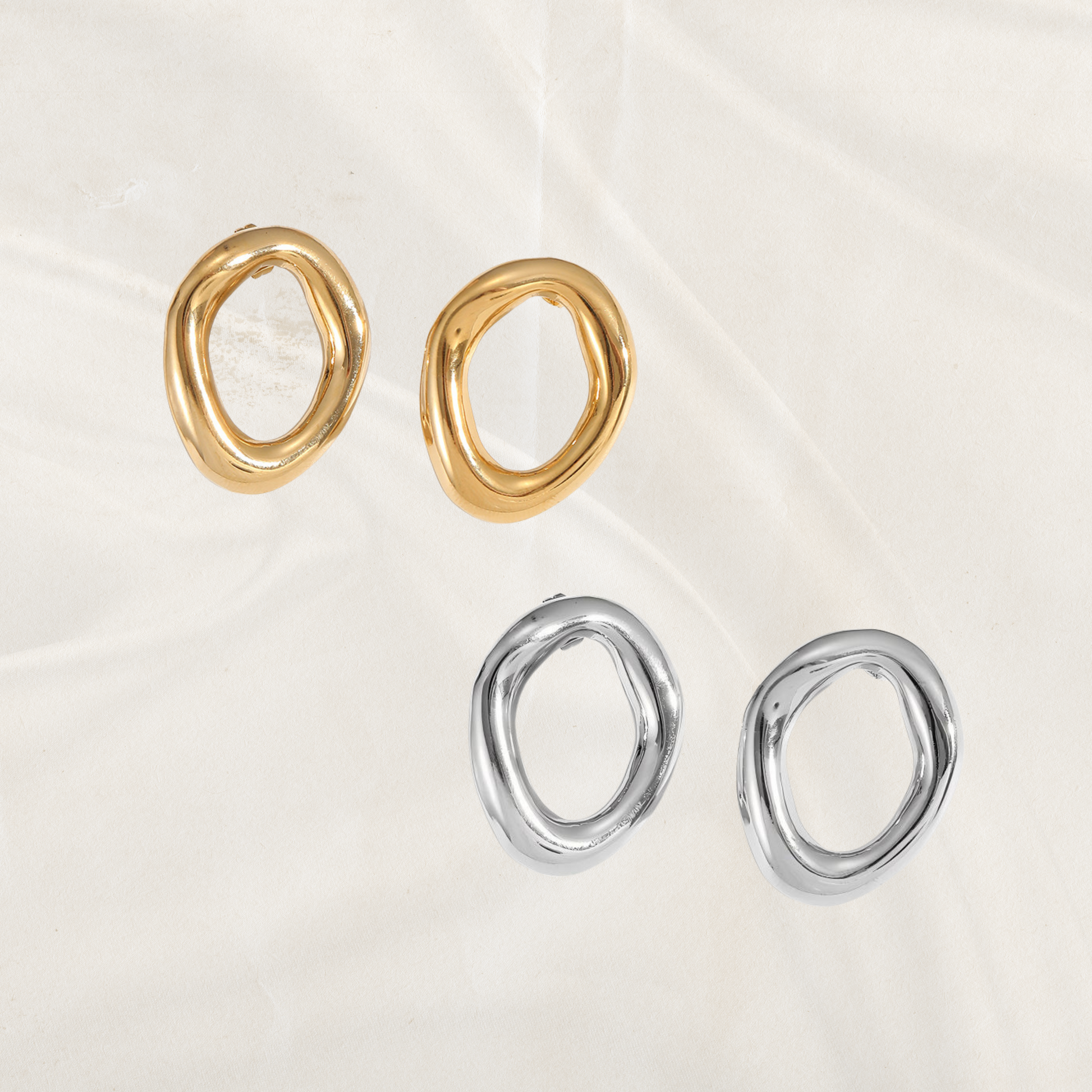 Apportez une touche moderne et élégante à vos looks avec ces boucles d’oreilles au design organique, disponibles en acier inoxydable doré ou argenté.